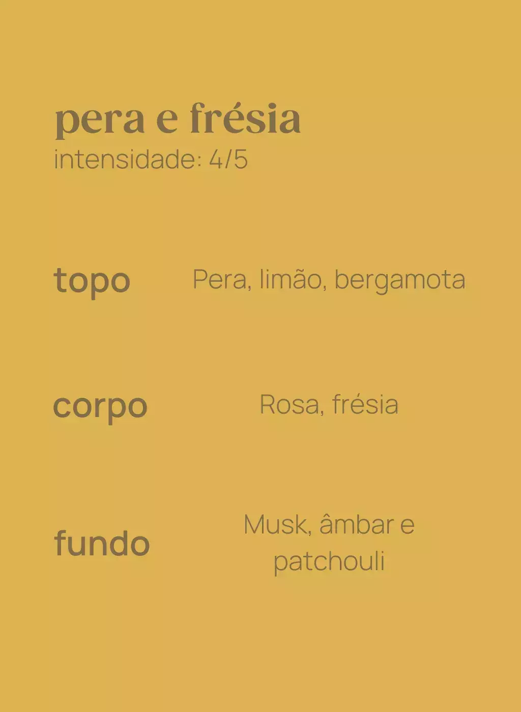 A Essência Concentrada Pera e Frésia combina a doçura delicada da pera com a sofisticação floral da frésia. Notas de fundo de musk, âmbar e patchouli adicionam profundidade, criando uma fragrância refinada, revigorante e envolvente para qualquer ambiente.